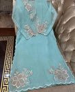 'Adorning the ethereal embrace of pure organza, this ensemble tells a story of timeless elegance. Each thread weaves a narrative of intricate embroidery, delicate appliqué organza flowers, and the artistry of cutwork adorning the daman and chawk. Every detail is a brushstroke on the canvas of style, creating a masterpiece of sophistication and grace