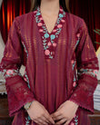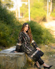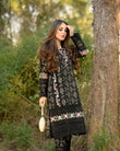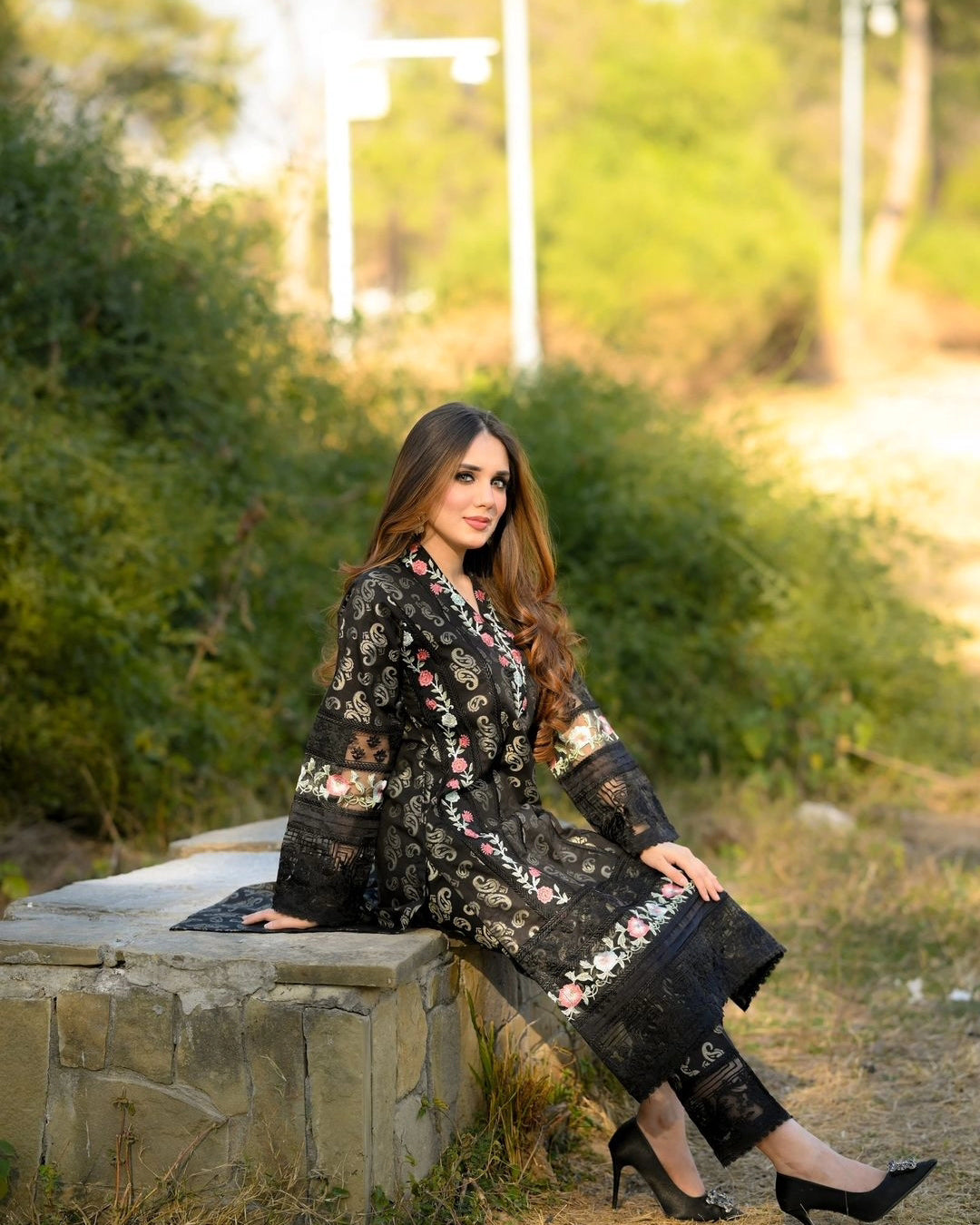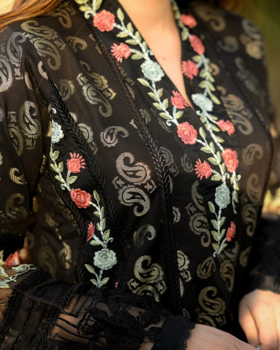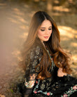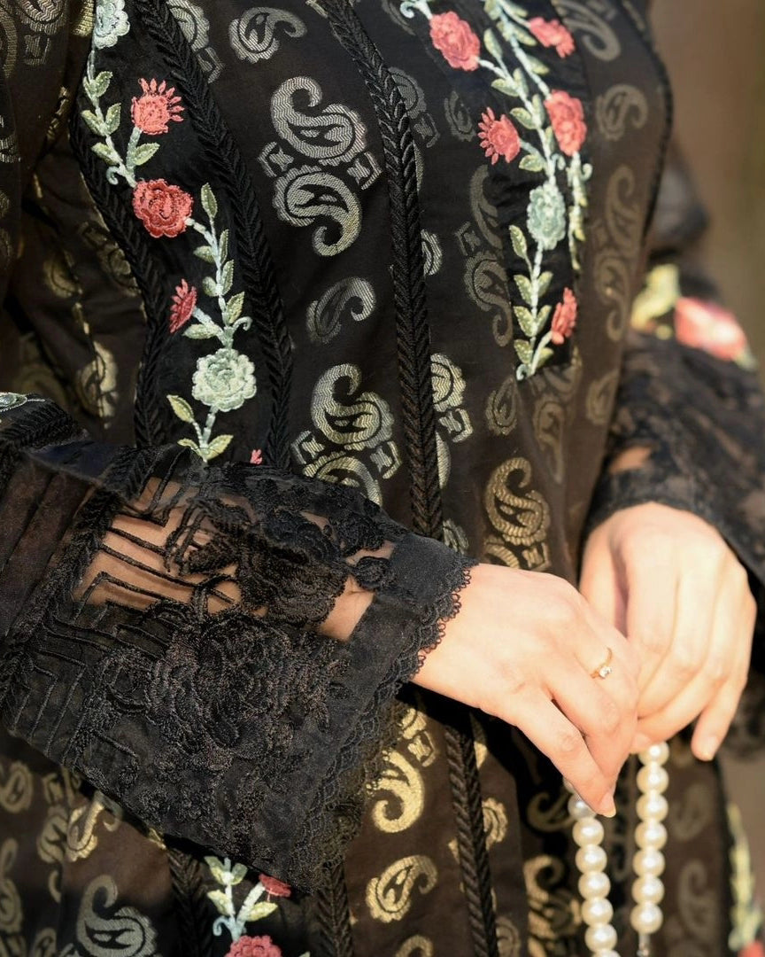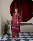 Jehanara is 2 pcs outfit including jacquard paneled shirt with exaggerated embroidered borders on shirt front and sleeves, paired up with cigarette pants with embroidered organza patch on it.