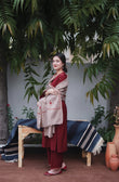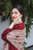 Introducing the SF-350, a stunning three-piece ensemble that draws its soul from the timeless beauty of Kashmiri craftsmanship. Crafted in a rich, warm maroon, this outfit is your perfect companion for the winter festive season, blending traditional artistry with a modern, chic silhouette.