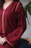 Kurta: Embroidered Neckline & Sleeves, Fabric: Wool Mareena, Color: Maroon